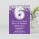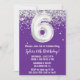 Purple et argent 6e anniversaire invitation à la fête à l'âge de 6 ans invitation à la fête avec parties scintillant et écriture de script moderne et ballon amusant.