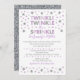 Cette adorable carte présente une parties scintillant en faux argent et des étoiles violettes.
