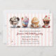 Célébrez l'enfant d'anniversaire avec une fête de bronzage à vous. Quatre sundaes de glace chargés sont présentés en haut de cette invitation avec un arrière - plan rayé léger qui rappelle un magasin de sucreries. Des gouttes de chocolat parsèment l'invitation. Idéal pour une fête d'anniversaire de crème glacée sundae, une fête de crème glacée sociale, ou une collecte de fonds. Disponible avec des produits correspondants.
