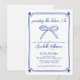 Quelque Chose De Bleu Avant Que Je Ne Fasse Une Invitation De Douche Nuptiale. Célébrez la mariée à être avec ce design élégant et intemporel, parfait pour une douche nuptiale chic. L'invitation comprend la phrase "Quelque chose de bleu avant que je ne fasse" en haut, écrite dans un mélange d'élégante calligraphie de script et de polices serif classiques dans les tons de bleu, donnant un ton charmant pour l'événement. Le design présente de délicates illustrations bleues, dont des accents floraux et des détails gracieux, disposées sur un arrière - plan blanc propre. Les détails de la douche sont présentés dans un mélange de polices de style serif classique et manuscrites, alliant sophistication et modernité. Cette invitation est entièrement personnalisable, vous permettant d'ajuster le texte et la mise en page pour convenir parfaitement à votre événement. Disponible sous forme de carte imprimée ou de fichier numérique téléchargeable, c'est un moyen élégant et mémorable pour les proches invitations de célébrer la mariée à être.