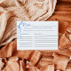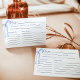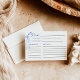 Ce quelque chose de bleu avant de faire Fête des mariées Recette Card comporte un élégant arc bleu pour décorer votre douche nuptiale bleu poussiéreux ou brunch nuptial. Ces cartes de recettes sont une belle touche à votre douche nuptiale avec notre décoration de Fête des mariées de Quelque chose de bleu avant de faire. Avec un espace abondant pour écrire vos recettes préférées, ce sera certainement un délicieux souvenir dans la cuisine des jeunes mariés pour les années à venir.
