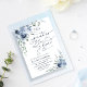 Cette invitation est un merveilleux symbole d'amour et de dévotion. Une palette de couleurs bleu clair doux crée un décor serein et apaisant, tandis que des motifs floraux délicats ajoutent féminité et élégance. Les détails complexes de l'ornement floral captivent et attirent l'oeil, attirant le spectateur dans l'invitation. La typographie de cette invitation est tout aussi étonnante, qui respire l'élégance et la grâce. Les mots "Quelque chose de bleu avant moi" qui ajoute une touche de quiétude et de romantisme, en indiquant clairement qu'il s'agit d'une célébration de l'amour. Des éléments correspondants sont disponibles.