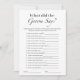 Présentation de "What Is the Groom Say?" - une carte de jeu de douche nuptiale noire et blanche chic et minimaliste, conçue par CaMiDesigns. Ce jeu amusant et engageant est parfait pour ajouter une touche d'excitation à votre douche nuptiale, permettant aux invités de tester leur connaissance des pensées et des expériences du marié. Avec son design élégant, il s'ajoute parfaitement à tout thème de douche nuptiale. Pour toute assistance concernant les commandes, l'expédition, les informations sur les produits, etc., veuillez contacter directement le service à la clientèle de Zazzle.