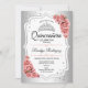 Invitation à la célébration de la Quinceanera blanche en argent. Caractéristiques police de script, roses rose pâle, tiara et confetti. Design rose acajou élégant avec fausse parties scintillant argent. Parfait pour une élégante célébration de glamour.
