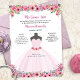Une jolie robe de soirée rose sur une forme de robe est exposée parmi les bouquets de jolies fleurs d'aquarelle rose sur le haut et le bas de cette invitation Quinceañera. Des étoiles roses pointent l'arrière - plan tandis que le dos a un motif étoile rose assorti. Disponible avec des produits correspondants.