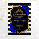 Invitation à la célébration de la Quinceanera en or noir bleu royal. Caractéristiques rayures, police de script, roses bleu royal, tiara et confetti. Design bleu saphir classique avec parties scintillant d'or faux. Parfait pour une élégante célébration de glamour.