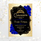 Invitation à la célébration de la Quinceanera en or noir bleu royal. Caractéristiques police de script, roses bleu royal, tiara et confetti. Design bleu saphir classique avec parties scintillant d'or faux. Parfait pour une élégante célébration de glamour.