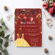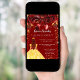 Une invitation moderne, élégante et glamour pour une Quinceañera, 15ème anniversaire. Un arrière - plan rouge avec une parties scintillant en faux or, une fille portant une robe dorée et des roses rouges, des fleurs et un arc. Le nom est écrit avec un script de style moderne écrit à la main. Personnalisez et ajoutez les détails de votre fête.