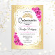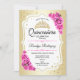 Invitation à la célébration de la Quinceanera en or noir et blanc. Caractéristiques police script, rose pastel roses, tiara et confetti. Design rose vif et élégant avec de l'or de parties scintillant imitation. Parfait pour une élégante célébration de glamour.