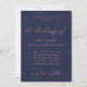 Cette faire-part de mariage élégante et élégante propose de nombreuses calligraphies d'apparence dorée tourbillonnant et moderne sur un arrière - plan bleu nuit profond.