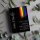 Arc en arc-en-ciel faire-part de mariage avec le drapeau de la fierté arc-en-ciel dessiné avec des traits désordonnés contre un arrière - plan noir. Vos noms dans une écriture manuscrite le long du côté gauche de la faire-part de mariage de la fierté.