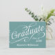 Arrière - plan bleu avec texte tourbillonnant blanc avec "diplômé", et une année personnalisée, idéal pour le diplômé d'annoncer la grande réalisation. Célébrez au dos avec le texte personnalisé de l'événement de réception pour vos invités. Tous les dessins © www.CustomInvitesOnline.com