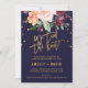 Cette carte de réception de mariage en fuite avec une floraison automnale est parfaite pour une fête post-mariage en fuite à l'automne. Le design présente un magnifique bouquet de fleurs rose saumon, orange pêche et bordeaux marsala avec une typographie en faux doré et des confettis. Le dos présente un arrangement floral coordonné avec une typographie de mariage magnifique. Les cartes de RSVP sont vendues séparément.