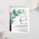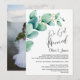 Invitez vos amis et vos proches à votre réception de mariage avec ce carton d'invitation orné de feuilles d'eucalyptus vertes aquarelles pour célébrer votre récent mariage qui présente une image du couple heureux au verso.