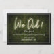 Une invitation à une réception de mariage avec un texte néon blanc "Nous l'avons fait !" sur un fond de buis avec texte et garniture blancs.