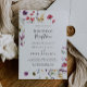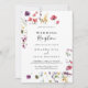 Cette invitation de réception de mariage classique aux fleurs sauvages colorées est parfaite pour une fête moderne après une fugue amoureuse. Le design présente des fleurs sauvages jaunes, violettes et blanches avec du feuillage sur un fond aquarelle rose et vert.