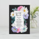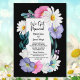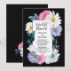 Une invitation de réception de mariage floral vibrant à bordure noire avec des fleurs roses et violettes, des marguerites blanches et de la verdure entourant le texte. Parfait pour les couples qui ont choisi de se marier lors d'une cérémonie privée et de célébrer avec des amis et des proches par la suite.