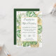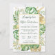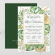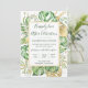 Cette élégante invitation de réception de mariage tropical élégant présente des feuilles de palmier, de philodendron et de fougère vertes et dorées. Un cadre doré élégant met en valeur le texte vert foncé. Des éclaboussures dorées accentuent ce design botanique exotique et apportent une touche de fantaisie moderne à l'invitation. "Célébration pour toujours heureux" ainsi que les noms de la mariée et du marié sont indiqués en haut. Les détails des vœux de mariage ainsi que le lieu et la date de réception sont détaillés au recto. Les informations de RSVP sont au verso de l'invitation.