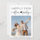 Faire-part de mariage ou d'élévation moderne et invitation à la réception de mariage. Le devant présente votre photo de jour de mariage et "Happily Ever After Party" dans un mélange de typographie simple et d'un script élégant avec un coeur et des swashes. Sous votre photo, ajoutez vos prénoms et votre date de mariage. Au contraire, ajoutez les détails de la partie ou de la réception et vos noms dans un script de type signature.