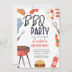 Red Bbq Blue Oven Mitt Boys Bbq Invitation anniversaire Boy's BBQ anniversaire invitation avec un Bbq rouge, bouteille en sauce, hamburger, mitt au four bleu, kebab, saucisses et plus encore dans le design d'invitation d'anniversaire jardin coloré.