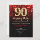 90e anniversaire invitation à la fête. Design noir rouge élégant avec de l'or de parties scintillant imitation. Dispose de diamants élégants, lumières de livres et police de script. Hommes ou femmes anniversaire invitation. Idéal pour une fête d'anniversaire pour adultes. Personnalisez avec vos propres détails. Message-moi si vous avez besoin d'une personnalisation plus poussée. Invitations Zazzle imprimées ou téléchargement instantané modèle imprimable numérique.