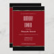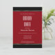 Une invitation sophistiquée à dîner d'anniversaire rouge et noir avec du texte blanc et des rayures dorées et argentées.