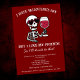 Red I Hate Valentine's Day Skeleton Drinking Wine Invitation - Célébrez l'anti-Valentin en février avec cette invitation gothique amusante et rétro inspirée. Parfait pour des fêtes stupides, anti-Saint-Valentin, ou des gens qui détestent la Saint-Valentin. Disponible en téléchargement numérique instantané. Tout le texte est modifiable.