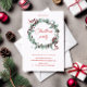 Invitation à la fête de Noël avec une aquarelle de verdure d'hiver en fer entrelacé de rubans rouges encerclés autour d'une police de caractères élégante 'fête de Noël'.