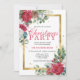 La fête de Noël est écrite dans un joli script rouge et le lieu de la fête est dans le même rouge. Le reste du texte est une police classique en italique noir. Les détails de la fête de vacances sont entourés d'un grand cadre doré. Il est décoré de roses rouges douces et de roses blanches. Des feuilles saints, des baies et des branches d'eucalyptus les entourent. Les confettis d'or sont parsemés en feuille pour lui donner une touche festive supplémentaire. L'invitation en retour est rouge doux.