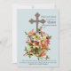 Un arrière - plan bleu poudre tient une croix argentée foncée entourée d'un amas de coraux et d'azalées blanches. Une invitation religieuse vintage pour toute réunion printanière.