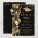 Cartes d'invitation élégantes pour la fête de remise des diplômes avec un fond noir stylé, paillettes dorées scintillantes, ballons et un modèle de texte moderne facile à personnaliser. Articles assortis disponibles.