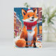 Illustration du joyeux renard anthropomorphe assis dans la rue animée de la ville, aujourd'hui transformé pour la saison des fêtes. Le renard, orné d'une écharpe rouge ludique et d'un chapeau de Père Noël minuscule, rayonne de joie. L'arrière - plan urbain est dépoussiéré de neige douce et blanche, créant une atmosphère cosy et festive. Les flocons de neige tombent doucement sur la scène, et les arbres qui bordent le trottoir sont ornés de lumières scintillantes et de décorations colorées. La voiture vintage bleu clair est maintenant revêtue d'une couronne sur le devant, ce qui renforce le charme fantaisiste.