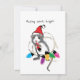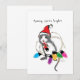 Mignonne petite souris de Noël grise et blanche dans le chapeau de Santa faisant des esprits brillants enveloppés dans les lumières de vacances, toutes les couleurs de l'arc-en-ciel. Art de Margaret Loftin Whiting.