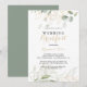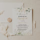 Cette invitation de repas de mariage calligraphiée avec feuillage vert et doré est parfaite pour un événement rustique. Ce design artistique présente un feuillage doré et vert dessiné à la main à l'aquarelle, inspirant la beauté naturelle.