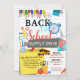 Retour à l'école bash à la fin de la fête d'été. Les caractéristiques de l'invitation : crayons, sac à l'école, livres, horloge, autobus scolaire, pomme, carnet en papier, gomme, ciseau... Fait une grande invitation à célébrer la fin de l'été et à lancer la nouvelle année scolaire. L'Invitation travaille très bien pour les événements scolaires, scolaires ou PTO/PTA parrainés par l'école! Commencez l'année scolaire par un message festif et coloré.
