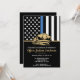 Ce design présente un drapeau de la force de police avec des bandes noires et blanches, ainsi qu'une fine bande bleue. Le badge de police et le texte doré se trouvent au-dessus de tous les détails de la fête pour la retraite de l'agent de la force de l'ordre, du shérif, du capitaine ou du chef en retraite.