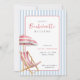 Joli rétro moderne rose et bleu Bachelorette ou invitation week-end d'anniversaire avec simple et invitant aquarelle chaise de plage et parasol.