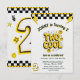 Vroom vroom! Get ready for a 'two cool' celebration with this retro-inspired birthday invitation. The bold yellow 'TWO COOL' graphic, complete with smiley faces and lightning bolts, pops against the white background. Accented with a black and white checkered flag border, this design is perfect for a second birthday party with a racing or fun, energetic theme. It's a fun way to invite guests to join the excitement.
