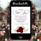 Cette belle faire-part de mariage présente un ensemble de roses peints à la main dans les tons rouge pourpre, bordeaux et rose roux, ainsi que des feuilles d'eucalyptus et des jardins verdoyants. Le titre est écrit dans des lettres de script fantaisie et dit : Rien de fantaisiste, Juste l'amour. Cet invitation est la combinaison parfaite de modernité et d'intemporel - il est à la fois classe et capricieux, ce qui le rend parfait pour une cérémonie formelle ou décontractée.