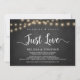 Magnifique carte d'annonce / invitation de mariage intime, Rien de fantaisiste, juste de l'amour, dans un style rustique de ferme avec tableau noir et guirlandes lumineuses. C'est parfait pour votre réception de mariage et votre fête de célébration après le mariage. Ajoutez vos détails dans la même police / lettrage. #TeeshaDerrick