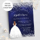 Une invitation moderne, élégante et glamour pour une Quinceañera, 15ème anniversaire. Un arrière - plan bleu marine avec une fausse parties scintillant, brille, une fille portant une robe de bal. La couleur bleue est inégale. Le nom est écrit avec un script de style moderne écrit à la main. Personnalisez et ajoutez les détails de votre fête.