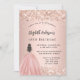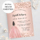 Une invitation moderne, élégante et glamour pour une fête d'anniversaire du 18ème (ou tout âge). Un arrière - plan rose en or avec des confettis, une fille portant une robe de bal. Le nom est écrit avec un script de style moderne écrit à la main. Personnalisez et ajoutez les détails de votre fête.