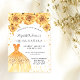 Une invitation moderne, élégante et glamour pour une Quinceañera, 15ème anniversaire. Un arrière - plan blanc sur le devant avec des étincelles d'or faux, une robe et des roses, des fleurs. Le nom est écrit avec un script de style moderne écrit à la main. Personnalisez et ajoutez les détails de votre fête. Dos : un faux arrière - plan à l'apparence or.