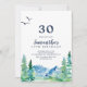 Cette invitation Rocky Mountain 30e anniversaire est parfaite pour une fête d'anniversaire en plein air. Le design comprend un paysage sauvage peint en bleu et vert avec des pins d'aquarelle, des oiseaux et des montagnes.