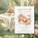 The background remains clean and luminous, allowing the illustrated elements to float gracefully while maintaining visual balance and clarity. Painterly textures, gentle shading, and organic transitions give the illustration a handcrafted, heirloom-inspired appearance. The overall color palette blends warm ivory, blush, champagne gold, and soft greenery, creating a romantic yet inviting atmosphere suited to daytime celebrations. Typography styling is elegant and flowing, echoing the curves of the florals and teaware while keeping the layout harmonious and readable.
