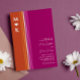 Faire-part de mariage lesbienne moderne avec un design rayé inspiré du drapeau de la fierté lesbienne personnalisée avec vos initiales et un coeur et vos noms dans un script signature.