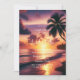 Une scène époustouflante de coucher de soleil sur la plage avec un ciel doré et violet, des vagues océaniques calmes et une silhouette noire d'un palmier sur la droite. Les teintes chaudes se reflètent sur l'eau, créant une atmosphère romantique et sereine, parfaite pour une faire-part de mariage.