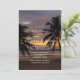 Une scène époustouflante de coucher de soleil sur la plage avec un ciel doré et violet, des vagues océaniques calmes et une silhouette noire d'un palmier sur la droite. Les teintes chaudes se reflètent sur l'eau, créant une atmosphère romantique et sereine, parfaite pour une faire-part de mariage.