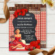 Une invitation romantique à la douche nuptiale avec thème barbecue, avec du bois rustique, un tableau noir, un tableau vintage d'une femme en robe rouge, des fleurs de coquelicots et de la dentelle sur un arrière - plan en vichy. Le dos est une combinaison de bois rustique avec dentelle sur un motif de rouge et d'ivoire en vichy.