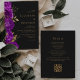 Cette faire-part de mariage florale sombre et romantique est ornée d'une bordure de fleurs violettes agrémentée d'un feuillage en faux feuille d'or. Les noms du couple apparaissent dans la police serif de couleur or classique, avec le texte restant en italique, sur un arrière - plan non noir. L'envers offre de l'espace pour les détails du mariage sur un arrière - plan sombre solide, ainsi qu'un code QR que les invités peuvent scanner pour visiter votre site Web et RSVP, ce qui permet d'économiser le coût d'impression et d'envoi de cartes RSVP séparées.
